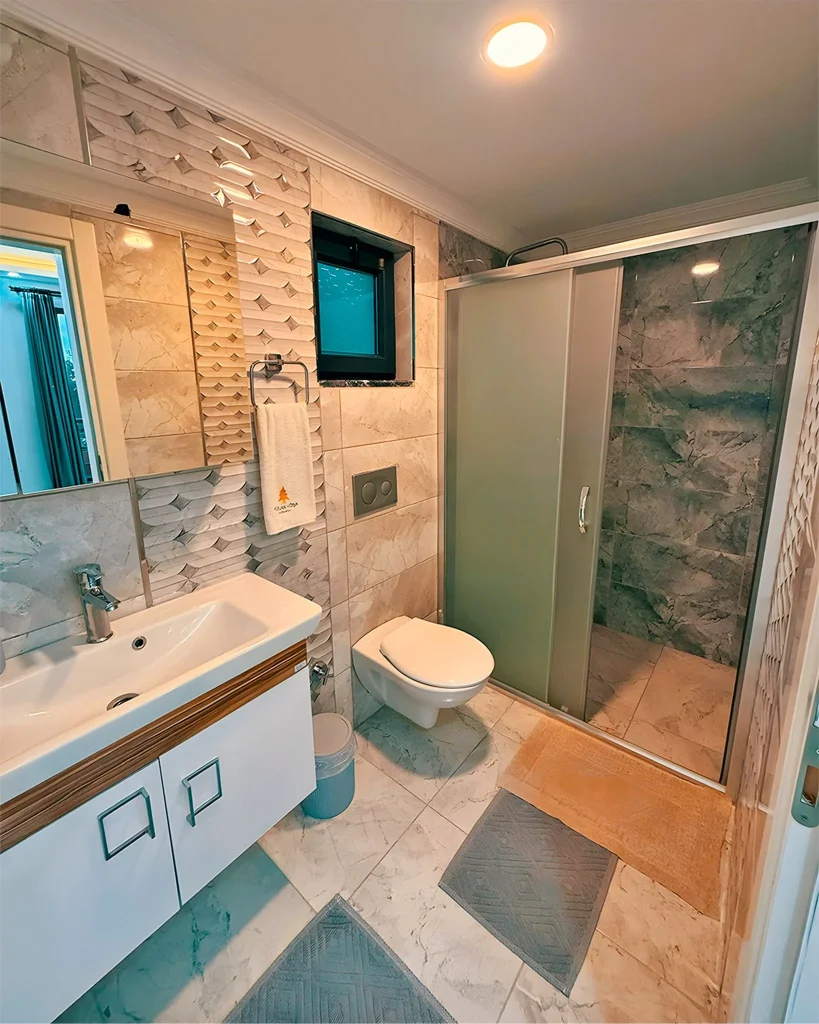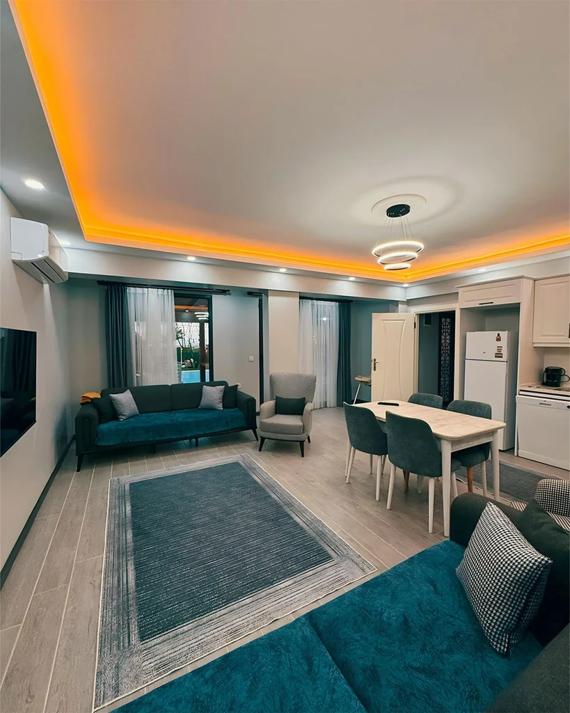 Klima, Smart TV ve Wi-Fi gibi modern olanaklarla donatılmış villalarımızda her an bağlı kalabilirsiniz. Açık mutfak tasarımı ile hem yemek yapabilir hem de manzarayı seyredebilirsiniz. Açık otopark ile araçlarınız için güvenli bir alan sağlanmıştır.