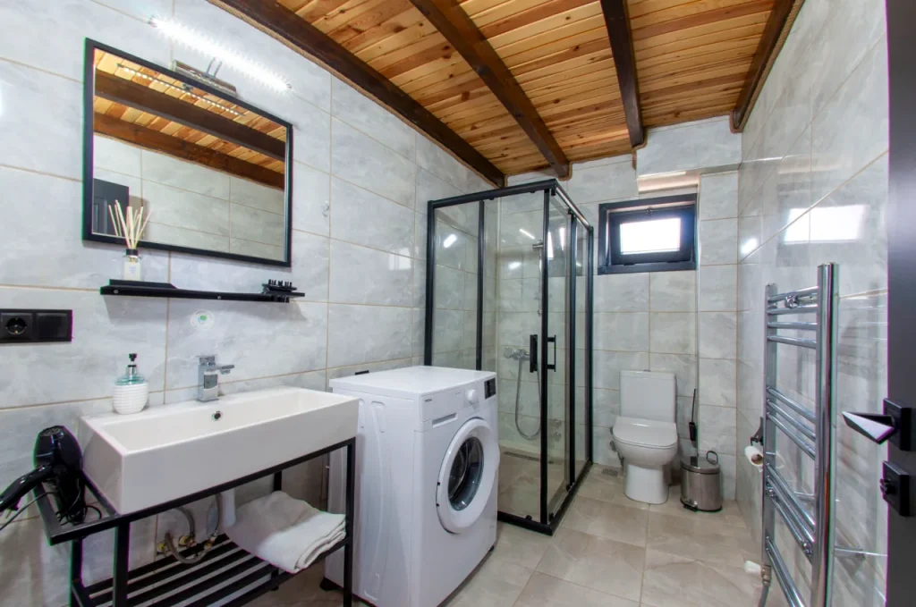 Villanın mutfağı tamamen donanımlıdır. Uzun süreli konaklamalar ya da ev konforunda yemek hazırlamak isteyenler için ihtiyaç duyabileceğiniz tüm eşyalar mevcuttur: bulaşık makinesi, çamaşır makinesi, buzdolabı, kahve makinesi, ocak, kettle gibi temel donanımlar eksiksiz şekilde yer almaktadır. Ücretsiz Wi-Fi hizmeti sayesinde hem tatil hem de dijital bağlantınız aksamadan devam eder.