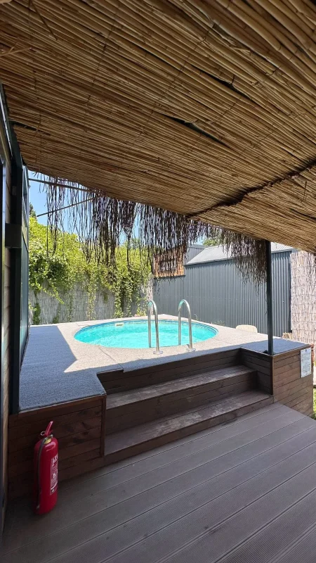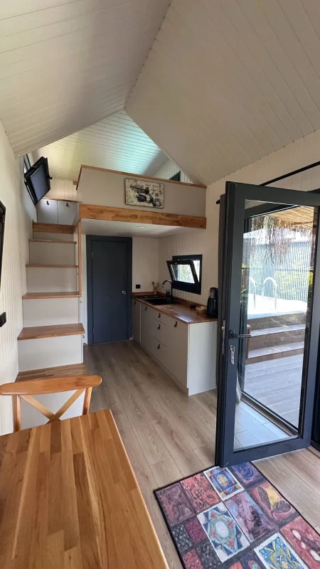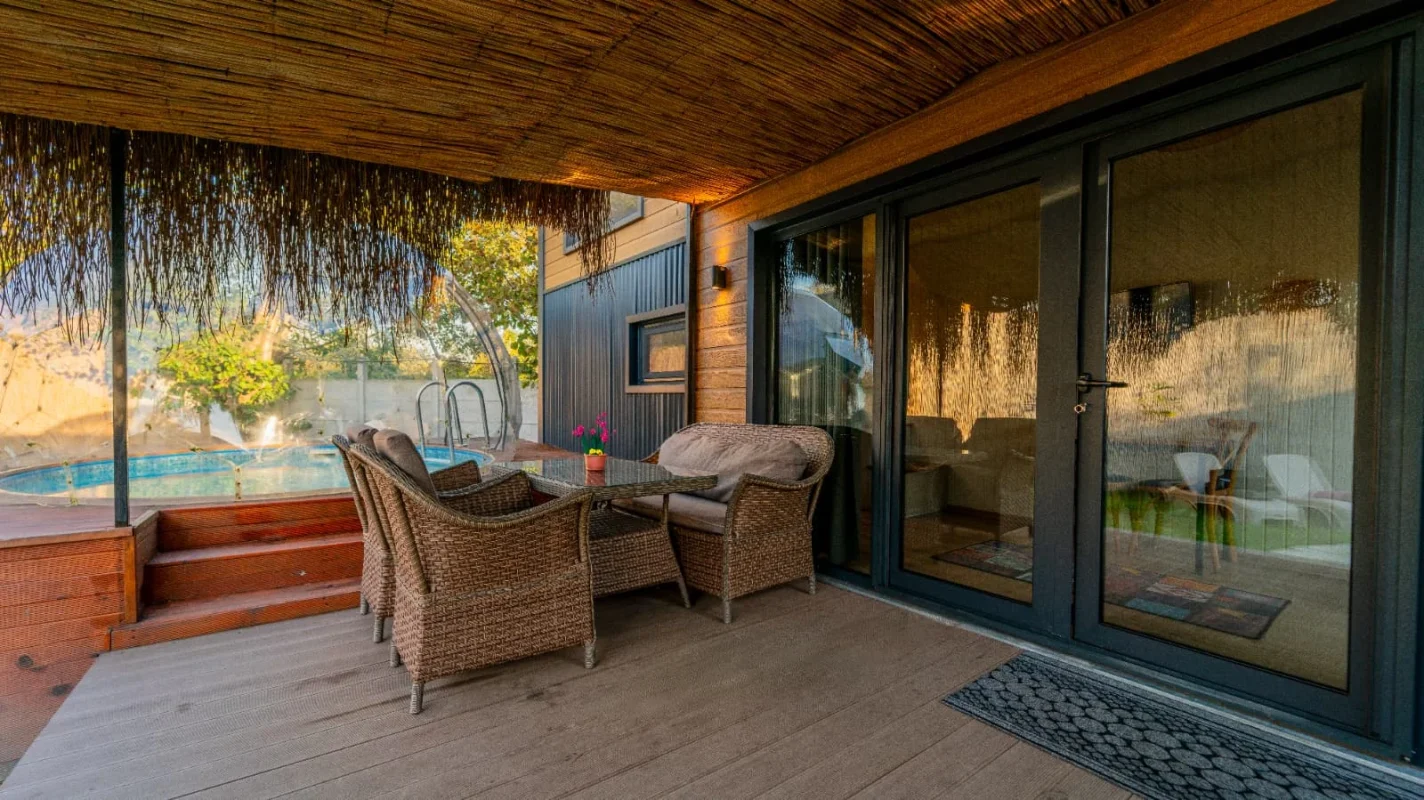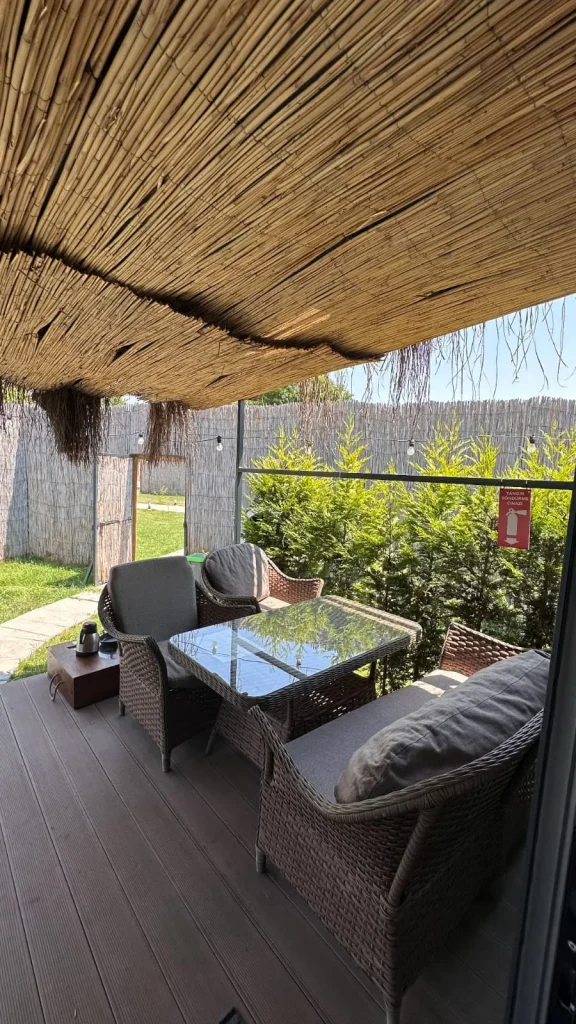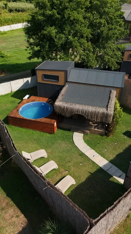 Her tiny house, müstakil bahçesi ve verandası ile özel bir alan sunar. Bahçede barbekü, ateş çukuru, oturma alanları ve yuvarlak sıcak havuz (jakuzi) bulunur. Böylece konuklar hem dinlenebilir hem de keyifli vakit geçirebilir.